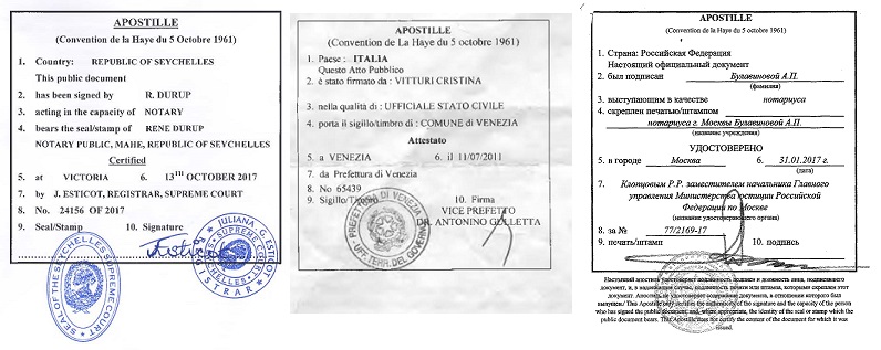 Этот новый вариант легализации («апостиль») значительно упростил ранее существовавший, а все государства участники смогли отказаться от затратной и длительной процедуры полной консульской легализации. Датой принятия Гаагской конвенции считается 5 октября 1961 года. Присоединение Советского союза произошло гораздо позже — 17 апреля 1991 года. Российская Федерация в качестве полноценного правопреемника СССР унаследовала и ратификацию Гаагской конвенции. Соответственно, если вы сталкиваетесь с тем, что документ был выдан во времена объединенного СССР (до 1991 года) в любой из его республик, то апостиль на нотариально заверенную копию можно проставить в России.